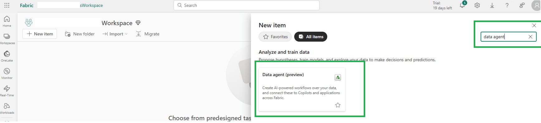 - In your workspace, click New > Data agent (preview).